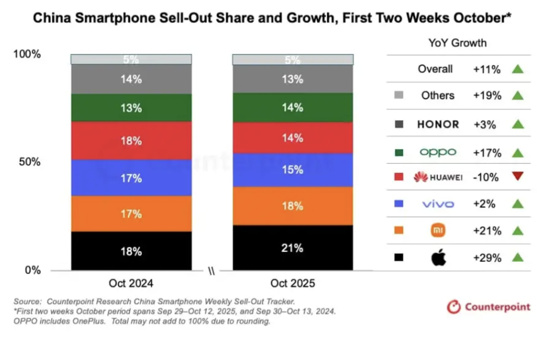小米在REDMI Note 15和K80系列的助力下,本季度销量同比增长1.1%,也是六大厂商中除OPPO外另一个实现正增长的品牌。近期发布的小米17系列自上市以来,凭借影像系统、高性能处理器以及快充技术,受到市场追捧,尤其是小米17 Pro和17 Pro Max两款高端机型,进一步提升了该品牌在高端市场的影响力,使得小米在10月上旬成为仅次于苹果的增长速度第二快的主流智能手机品牌。