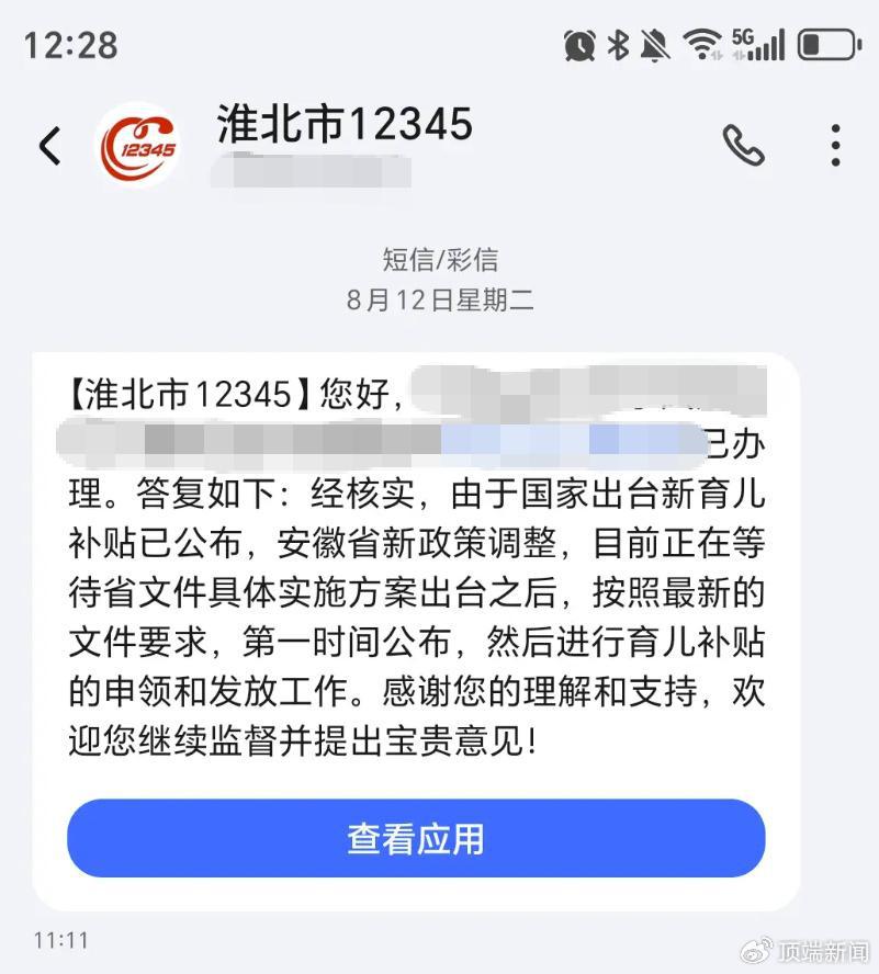 除安徽六安外,社交媒体上还有许多内容反映安徽其他地区的二胎补贴问题。一则安徽淮北市 12345 热线的回复显示:由于国家出台新育儿补贴已公布,安徽省新的政策对补贴有所调整,目前正在等待省文件具体实施方案出台之后,按照最新的文件要求,第一时间公布,然后进行育儿补贴的申领和发放工作。