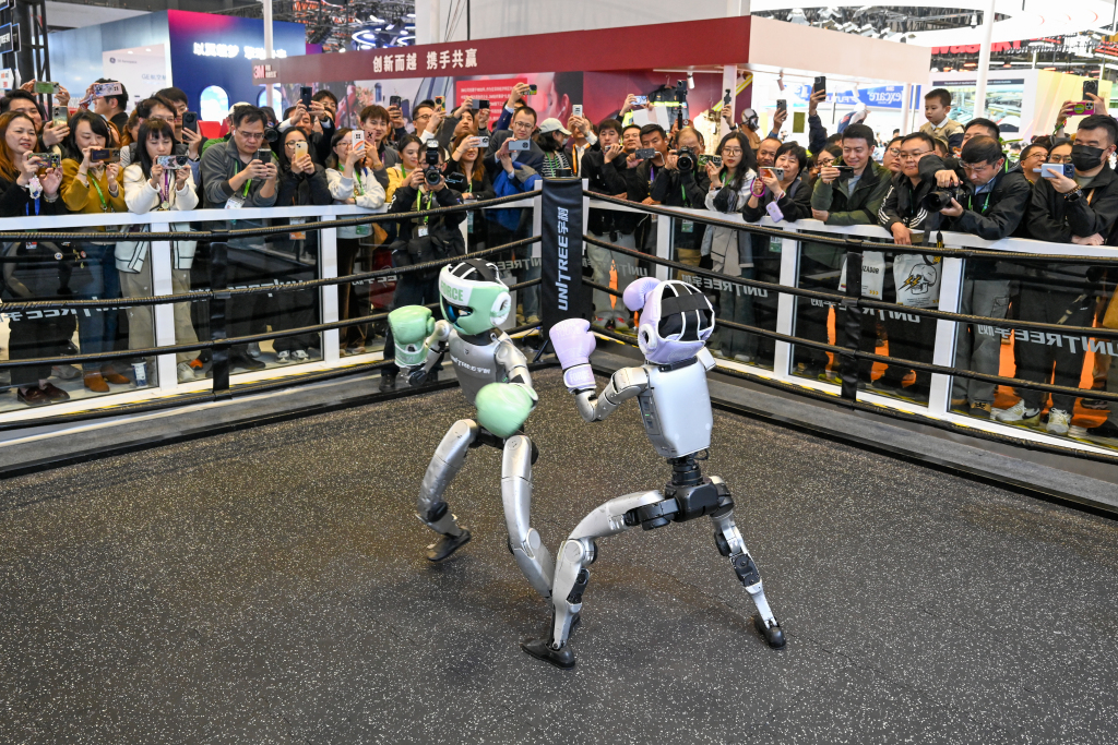 2025年11月7日,国家会展中心(上海),在第八届进博会宇树科技展台,人形机器人进行格斗表演。澎湃新闻记者 朱伟辉 图