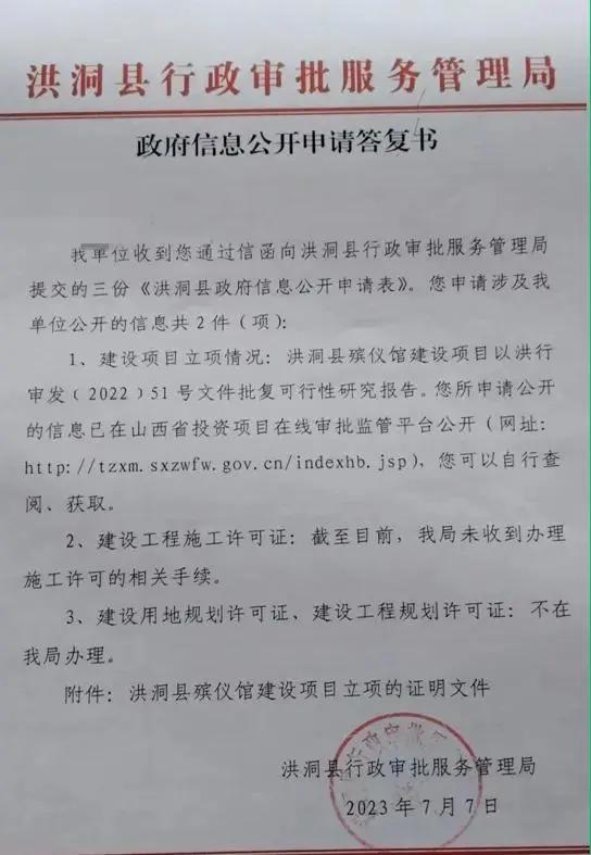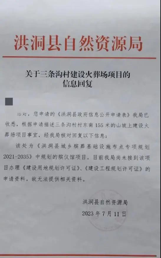 洪洞县自然资源局在 2023 年 7 月出具的《关于三条沟村建设火葬场项目的信息回复》中,也明确写明:" 目前我局尚未接到该项目办理《建设用地规划许可证》《建设工程规划许可证》的申请资料。故无法提供相关资料。"