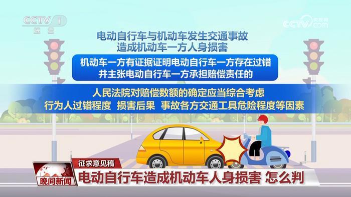 央视网消息:最高人民法院 11 月 9 日就审理交通事故责任纠纷案件适用法律若干问题的解释,向社会公开征求意见,截止日期为 11 月 15 日。乘客 " 开门杀 ",车险赔不赔?电动自行车与机动车发生交通事故,如何界定法律责任?来看征求意见稿的内容。