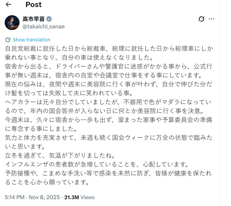 为了凸显自己真的很忙且不喜欢麻烦他人,高市还在 X 上发帖诉说了自己 " 首相的烦恼 " ——就任以后外出不能使用私家车," 无法在晚间或周末去美发厅,自己把长长的部分头发剪掉,结果剪坏了被丈夫笑话 "。她解释称如果自己离开宿舍外出,会给司机和警卫添麻烦。