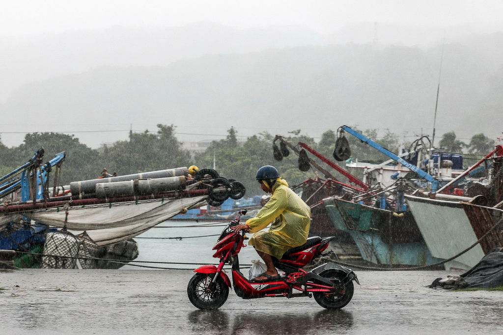 11月11日,台湾宜兰,台风“凤凰”逼近,一名男子在大雨中骑行。