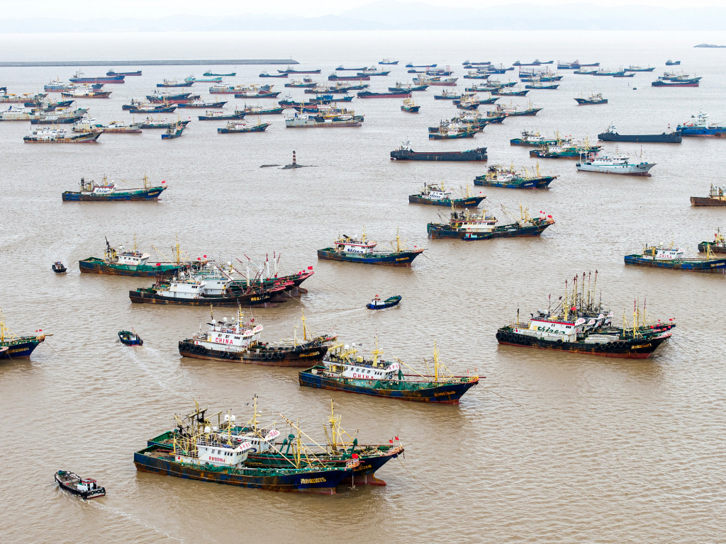 11月11日,浙江温岭,受今年第26号台风“凤凰”影响,箬山渔港内大批渔船整齐停靠。