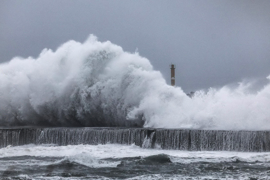11月11日,台湾宜兰,台风“凤凰”逼近,海浪拍打着海堤。