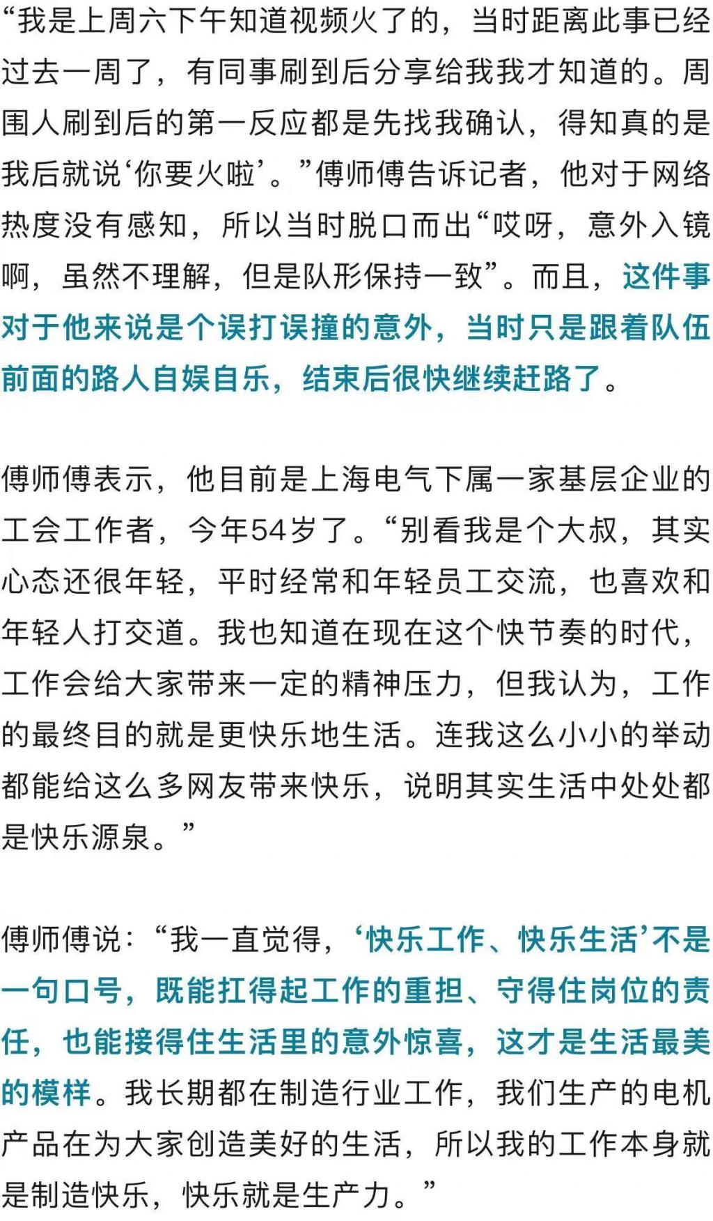 11 月 12 日,傅师傅告诉记者,没有提前沟通,纯属 " 意外走红 "。他回忆,10 月 31 日下午,他和同事参加完一个行业会议后回到上海,抵达浦东机场后,无意中在传送带上看到前面的几个路人摆出舞蹈姿势," 我觉得很有趣,被氛围感染后就加入了,就像网友们说的,‘不理解但照做’。"