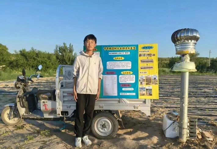 这个装置比贾明轩还高,每次失败都要全拆了逐环节排查。而为找实验场地,周末爸爸骑车带他往返 30 公里回村里:凌晨四点起床埋装置,赶早班车回旗里上课,下午放学后再冲回村里记录数据。手上磨出茧子,衣服沾满沙土,他却从没喊过累。直到第五次改良,当看到装置底部积起一小瓶盖水时,这个 14 岁少年蹲在沙地里,高兴得直拍手。