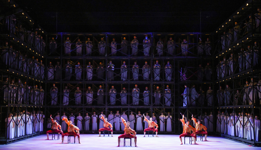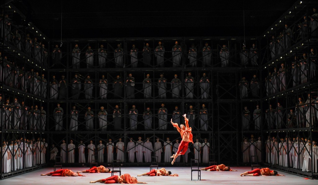 “奥尔夫的音乐充满力量,十二世纪的歌词直白又深刻,这些都让舞者的每一个动作都能爆发能量。”卫承天特别提到舞台设计的巧思:8米高的环绕式高台还原修道院氛围,合唱团层层站立其上与台下乐团呼应;空中悬挂的轮盘上,舞者伸展肢体宛如《维特鲁威人》,既呼应“命运之轮”,又象征主角追寻的“天使”。而与《布兰诗歌》同台的《最后的歌》,则是港芭驻团编舞家胡颂威以王尔德《夜莺与玫瑰》为灵感的作品,16米长的“空中天梯”取代了原著中的玫瑰,象征着人们追逐的欲望。