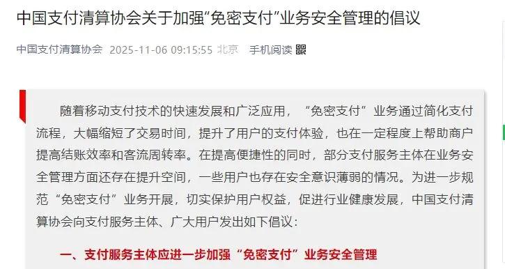 近日,中国支付清算协会发布《中国支付清算协会关于加强 " 免密支付 " 业务安全管理的倡议》,再度将 " 免密支付 " 引向舆论的聚光灯下。