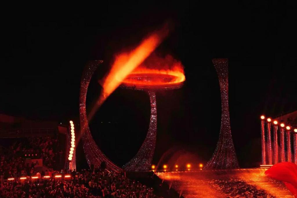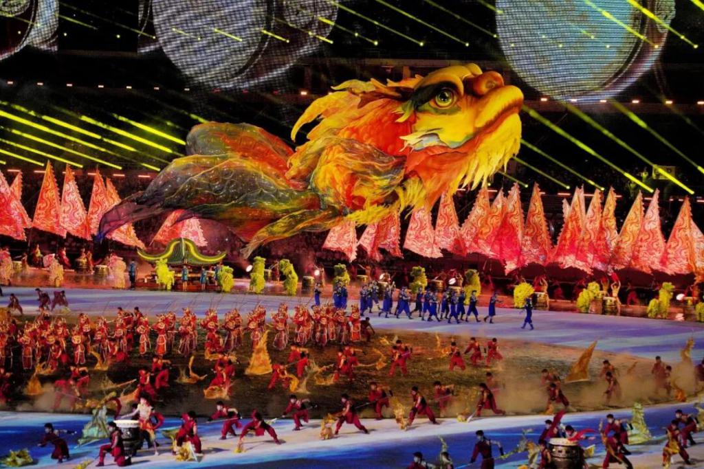 全运会开幕式上,醒狮与 VR 共舞、英歌舞与全息投影和鸣,技术团队通过光影投影和 AR 技术营造出 9 条活灵活现的 " 龙舟 ",英歌舞队员也 " 变身 " 龙舟队形,以昂扬舞姿绘就中华民族乘风破浪、百舸争流的激情画卷,展现着 " 比 " 的激情。