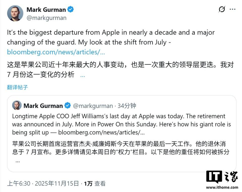 IT 之家 11 月 15 日消息,彭 · 博社的马克・古尔曼(Mark Gurman)今天(11 月 15 日)在 X 平台发布推文,报道称苹果公司前首席运营官杰夫・威廉姆斯(Jeff Williams)今天已正式退休离职。