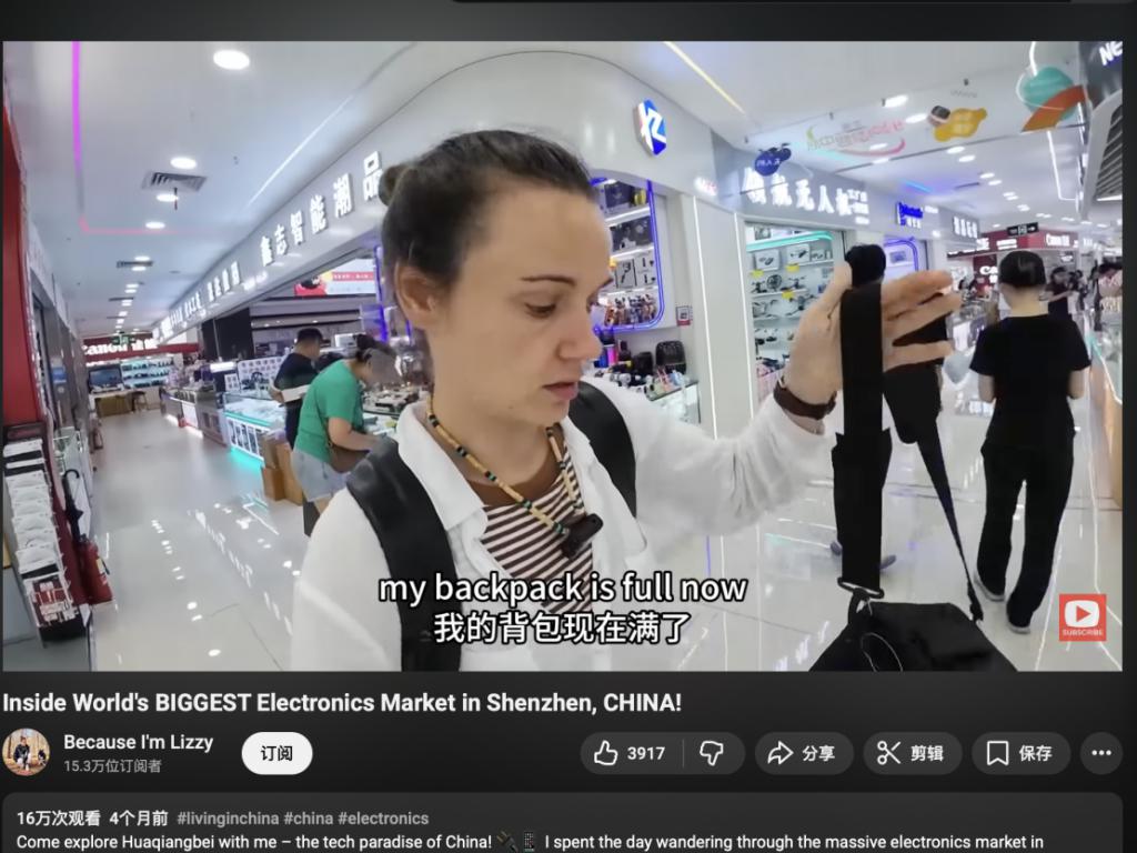 在海外社交媒体平台上,华强北是外国博主来深圳游玩的必打卡点位。南非博主 "Because I ’ m Lizzy" 在华强北商场里连逛多个店铺和档口,指着智能手表、充电宝、耳机等电子产品逐一向商家询价。优惠的价格和丰富的功能让她直接开启 " 买买买 " 模式,并表示:" 我的背包现在已经装满了,价格真的很优惠。"
