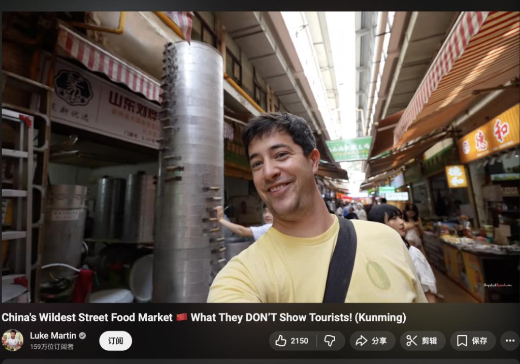 科技之外,中国文化同样令人着迷。加拿大博主 "Luke Martin" 直接走进了昆明大观篆新农贸市场,在一餐一饭的烟火气里,体验当地人的生活,了解其特色美食文化,更有不少用户在其评论区里表达了对中国饮食文化的赞美和向往。