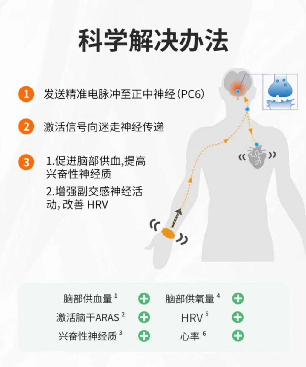 技术原理上,产品声称采用经皮神经电刺激(TENS)技术。根据其官方网站 EmeTerm 的介绍,这种技术通过刺激手腕正中神经,以增强大脑血流量,激活兴奋性神经递质,提升额叶含氧血红蛋白并减少褪黑激素分泌,从而提高警觉度。