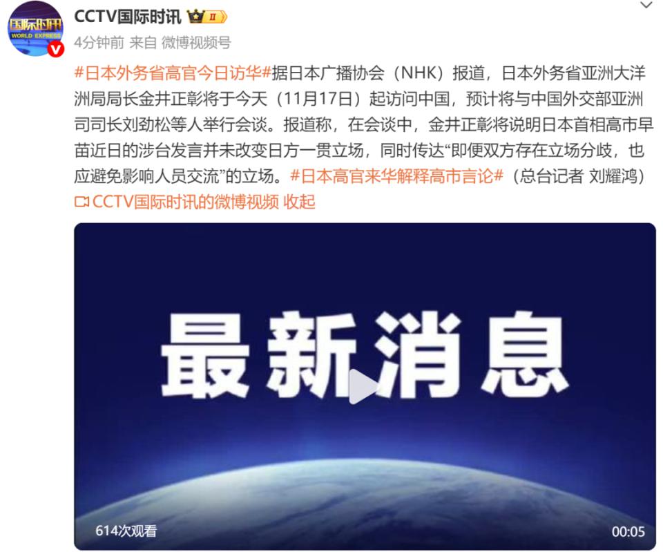 据日本广播协会(NHK)报道,日本外务省亚洲大洋洲局局长金井正彰将于今天(11 月 17 日)起访问中国,预计将与中国外交部亚洲司司长刘劲松等人举行会谈。报道称,在会谈中,金井正彰将说明日本首相高市早苗近日的涉台发言并未改变日方一贯立场,同时传达 " 即便双方存在立场分歧,也应避免影响人员交流 " 的立场。