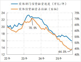 与微观主体物价预期等因素相对应,居民与企业还在持续地进行着资产负债表的调整。截止到10月末,社融口径下信贷投放速度为15.9万亿/年,较去年同期下降了2万亿,信贷占社融比重由去年同期的57%将至44%,从信贷占社融比重口径来观察,本轮实体部门资产负债表的调整已经持续了29个月(从2023年6月份开始)。