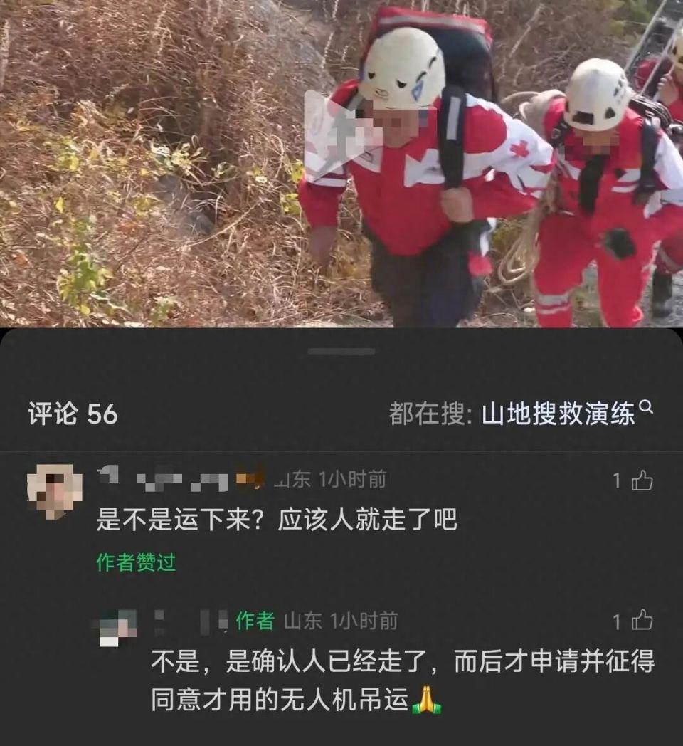 根据网络上流传的视频信息,记者检索发现,11 月 17 日上午 9 时许,当地一支公益救援队在其官方微信公众号上发布了一条视频,内容涉及 " 山地搜救演练遇实战 "。视频显示,救援队员装备齐全,在动员后乘车出发,随后画面切换至队员在陡峭山岩间行动,并出现了无人机参与救援的场景:无人机垂下挂钩,连接至一副盖有银色保温毯的担架,随后将其吊运至半空。由于保温毯覆盖,无法看清担架上人员的具体情况。