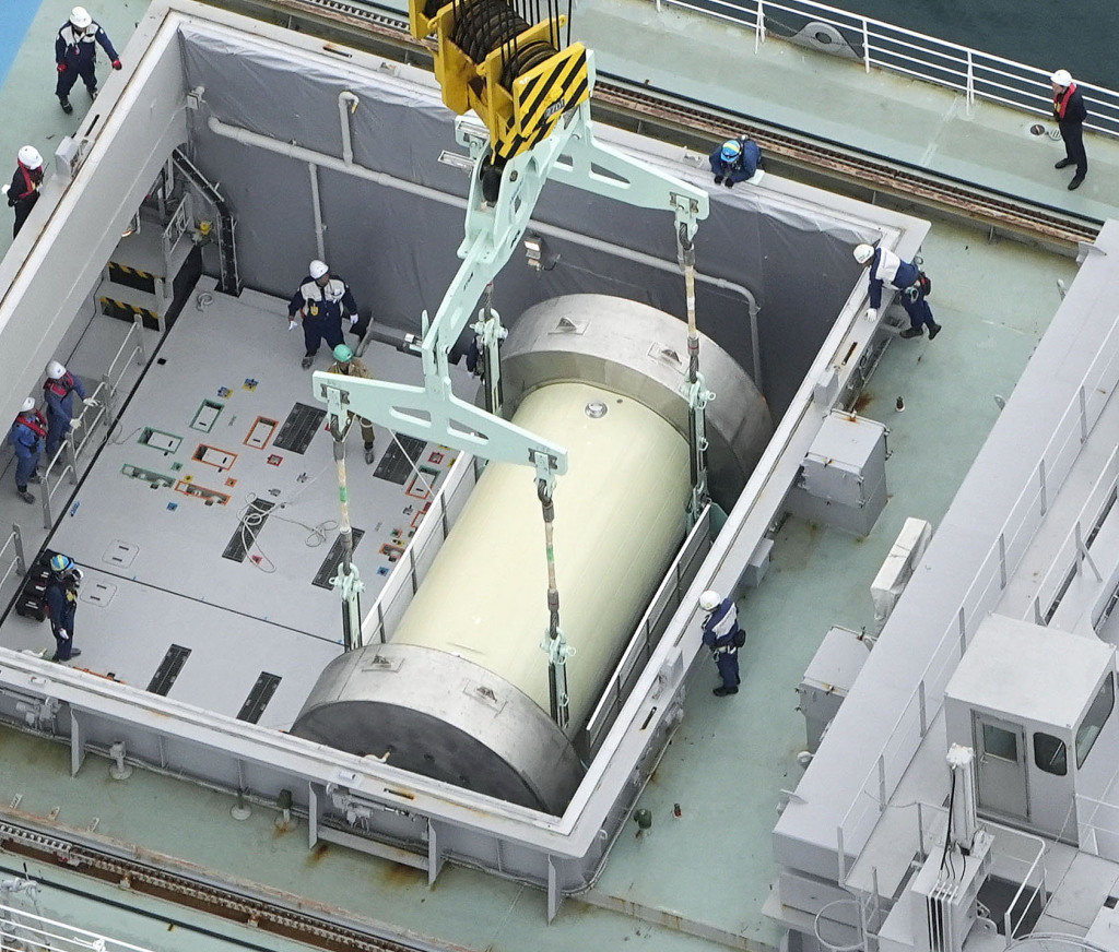 当地时间2024年9月26日,日本青森县陆奥市,工作人员正在吊起柏崎刈羽核电站的废弃核燃料容器。视觉中国 图