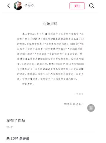 道歉声明显示,2024 年 7 月 11 日,兰世立通过今日头条及抖音账号 " 兰世立 " 发布视频,标题为《武汉用油罐车运食油的事太离谱了!》,并在视频中发表了 " 金龙鱼两天之内跌了 6500 亿 "" 运油以后连清洗都不清洗 "" 金龙鱼第一个就该退市 " 等不实言论,构成对益海嘉里名誉权的侵犯。