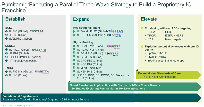 BioNTech进度更靠前的Pumitamig针对小细胞肺癌、非小细胞肺癌、三阴乳腺癌的全球III期临床也在推进中,后续亦有更多开发计划。