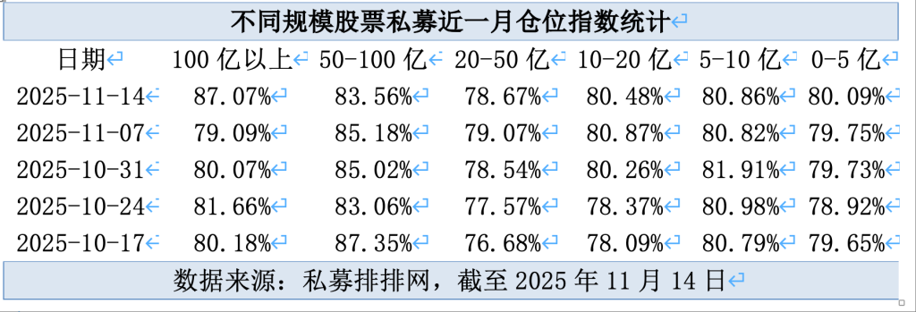具体来看,私募排排网数据显示,截至11月14日,不同规模股票私募仓位呈现差异化分布,各区间仓位指数依次为:100亿元以上规模87.07%、50亿元-100亿元规模83.56%、20亿元-50亿元规模78.67%、10亿元-20亿元规模80.48%、5亿元-10亿元规模80.86%、0-5亿元规模80.09%。