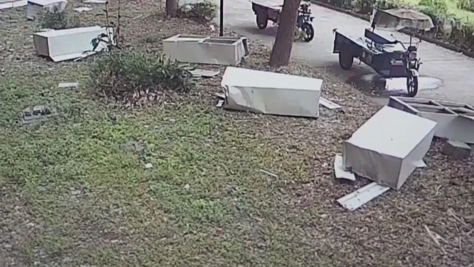 事发当天早上,嘉善一家公司的宿舍楼,几十个铁皮柜被人从五楼和六楼窗口接连抛下来,不仅砸坏了宿舍楼的门头,还险些砸到路人头上。