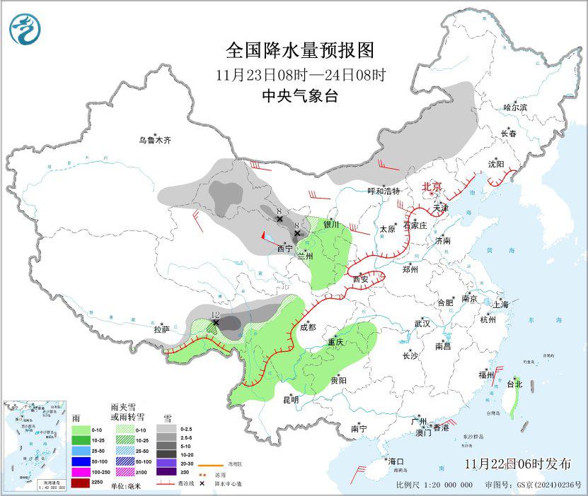 11 月 23 日 08 时至 24 日 08 时,甘肃西部、内蒙古中部、西藏东部、川西高原北部等地的部分地区有小雪或雨夹雪,其中,西藏东北部、川西高原北部、甘肃西部等地的部分地区有中到大雪,局地暴雪 ( 10~12 毫米 ) ,新增积雪深度 4~8 厘米,局地可超过 10 厘米;甘肃东部、宁夏、陕西西南部、四川西部、重庆、云南北部、贵州西北部等地部分地区有小雨。内蒙古中西部、青海北部、陕西北部等地部分地区有 5~6 级风,阵风 7~9 级;巴士海峡、南海东北部和中东部有 6~7 级风,阵风 8 级。