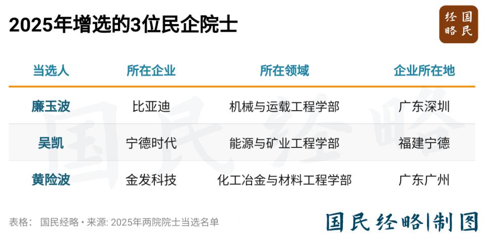 更为瞩目的是,新一届院士增选,全国共有 3 位民企科学家入围,数量创新高,比亚迪、宁德时代、金发科技在列。