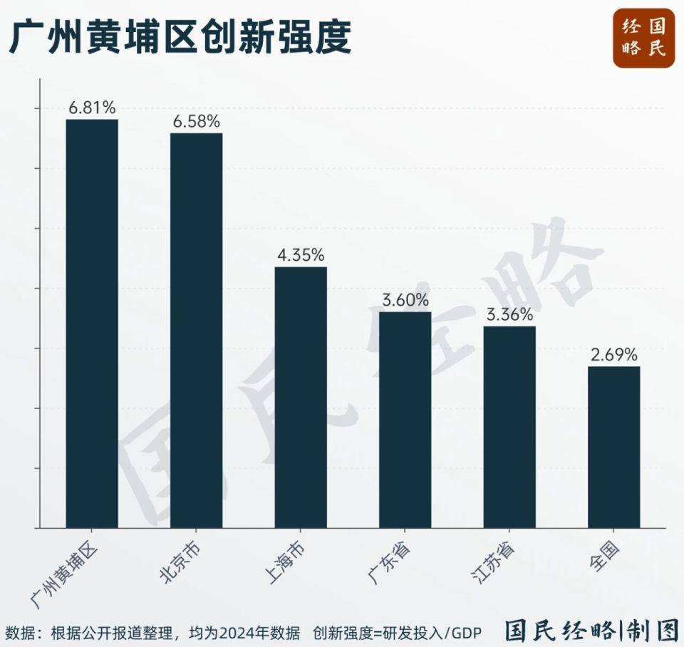 论创新实力,黄埔区、广州开发区 2024 年研发强度(研发投入 /GDP)高达 6.81%,达到世界一流水平,分别相当于全省、全国的 1.9 倍、2.5 倍,一个区的研发投入超过西部、东北的 11 个省份。
