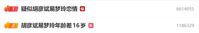 此前,11 月 19 日,话题 " 疑似胡彦斌易梦玲恋情 " 登热搜,两人相差 16 岁。