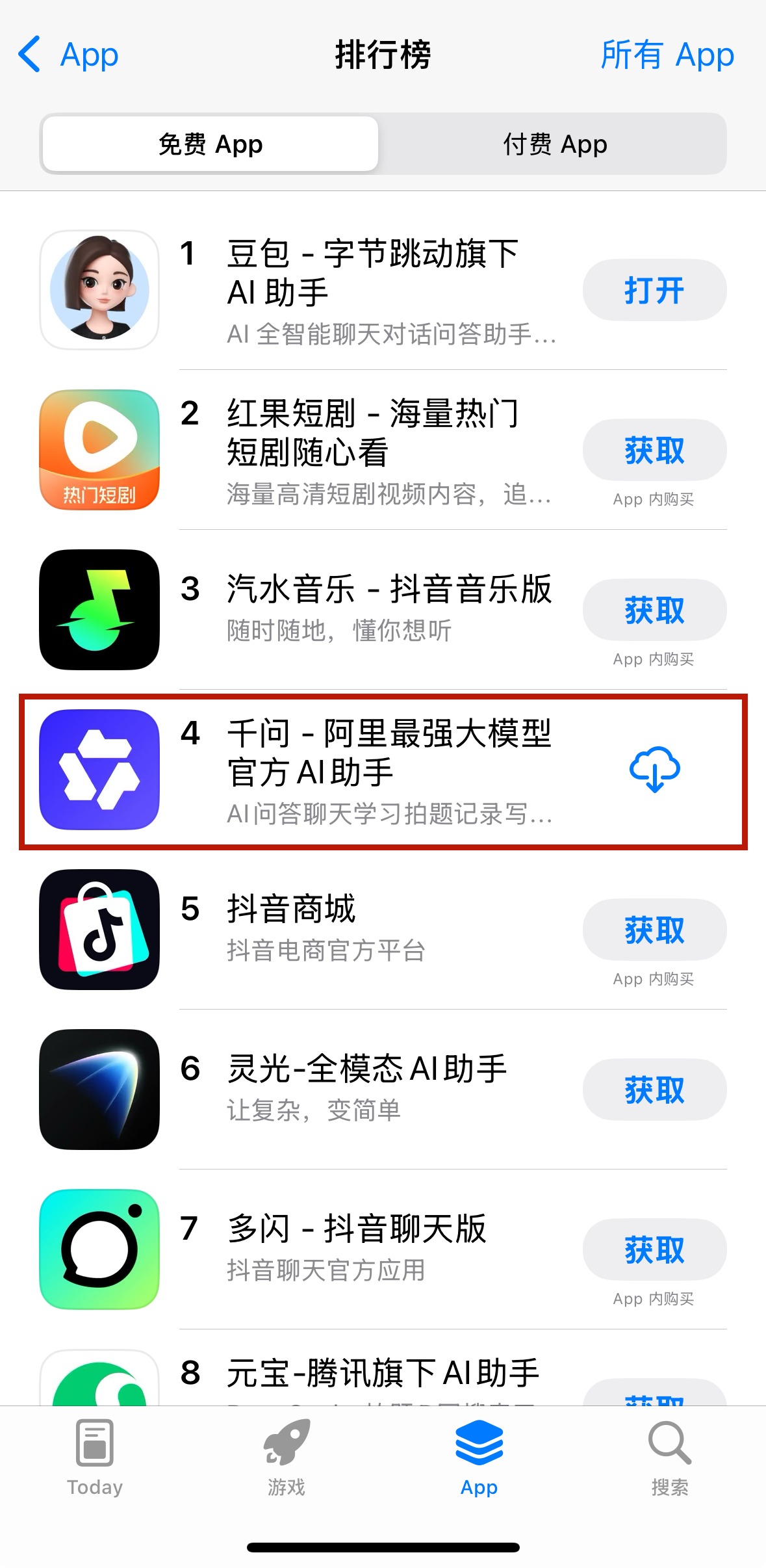 千问于11月17日正式开启公测,主要瞄准消费端市场。该应用基于阿里的开源模型Qwen3开发,免费向用户开放,直接与行业头部应用ChatGPT展开竞争。上线次日,千问APP便迅速攀升至苹果App Store免费应用总榜第四位,两天后又冲入该榜单前三甲。目前略有下降,已重新回到第四位。