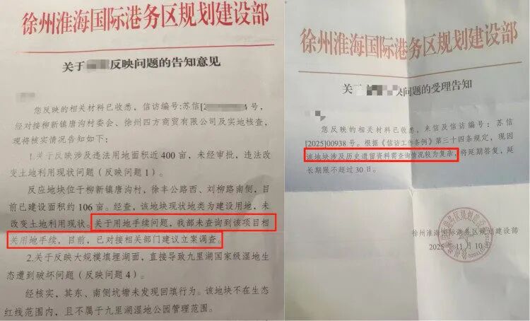 针对村民提到的该项目是否手续齐全,以及是否对九里湖国家级湿地保护区造成破坏的问题,上游新闻记者注意到,在2025年10月14日,徐州淮海国际港务区规划建设部给村民的“告知意见”中提到,反映地块位于柳新镇唐沟村,徐丰公路西、刘柳路南侧,目前已建设面积约106亩。经查,该地块现状为建设用地,未改变土地利用现状。但未查询到该项目相关用地手续。目前,已对接相关部门建议立案调查。同时,“告知意见”还提到,未发现东、南两侧坑塘回填行为,且该地块不在九里湖生态红线范围内。