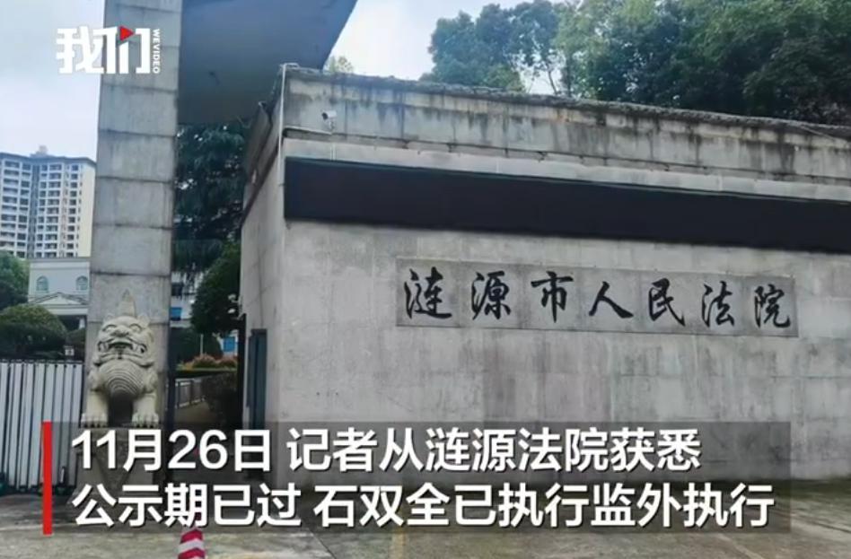 11 月 26 日,记者从涟源法院获悉,公示期已过,石双全已执行监外执行。记者从涟源市教育局获悉,对石双全的相关处理程序正在进行。