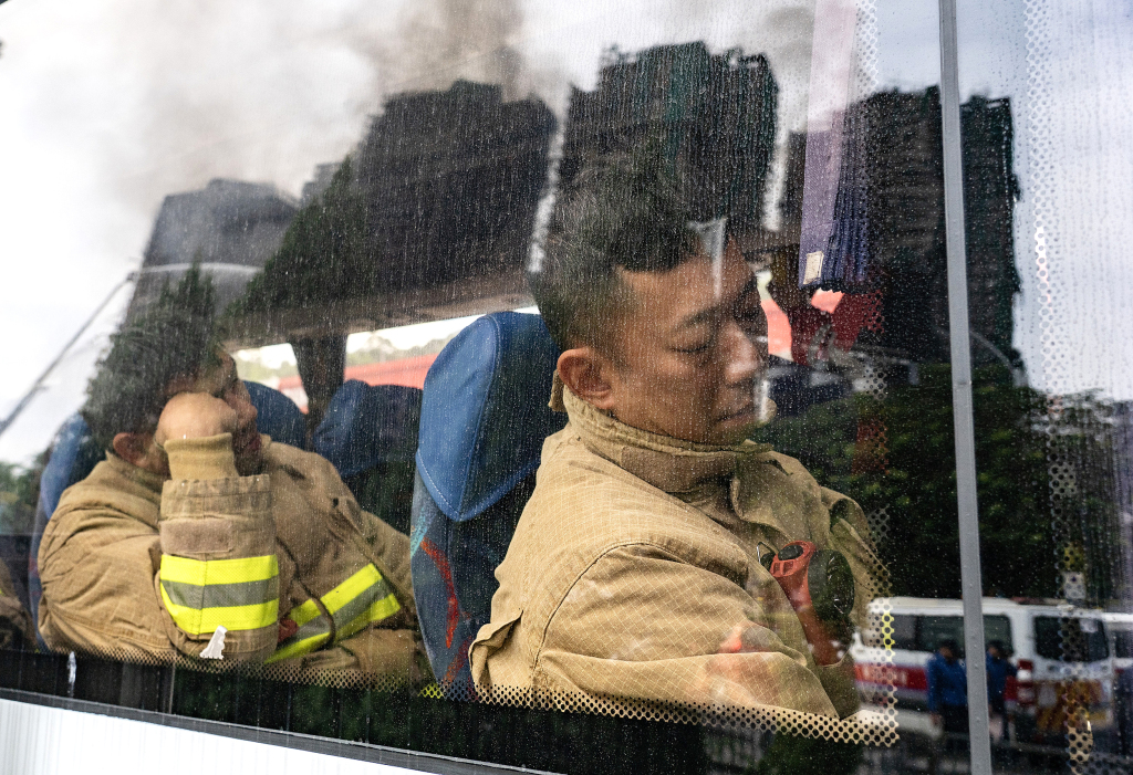 11月27日上午,消防人员持续在香港大埔宏福苑火灾现场进行救援,轮替的消防员短暂休息。