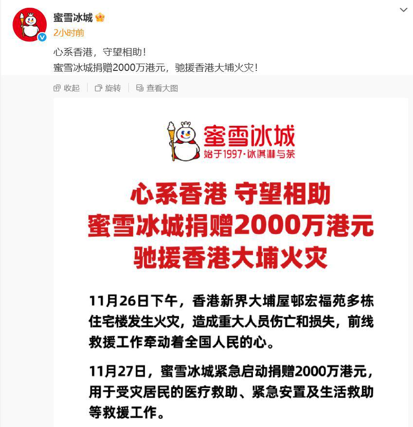 11 月 27 日,蜜雪冰城发文称,捐赠 2000 万港元,驰援香港大埔火灾。