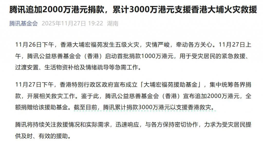 11 月 27 日晚,腾讯基金会称,追加 2000 万港元捐款,累计 3000 万港元支援香港大埔火灾救援。