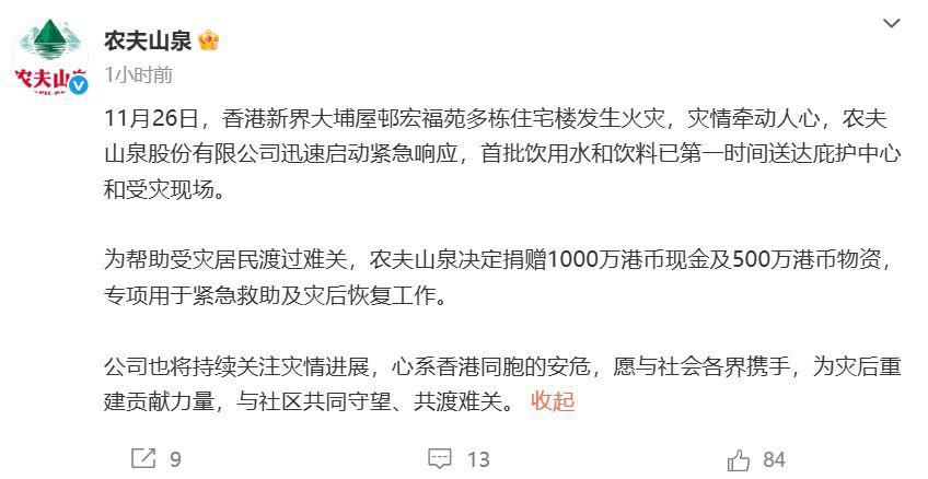 农夫山泉称,决定捐赠 1000 万港币现金及 500 万港币物资,专项用于紧急救助及灾后恢复工作。