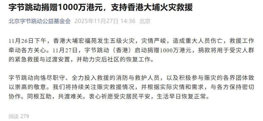 字节跳动捐赠 1000 万港元,支持香港大埔火灾救援,捐款将用于受灾人群的紧急救援与过渡安置,并助力灾后社区的恢复工作。