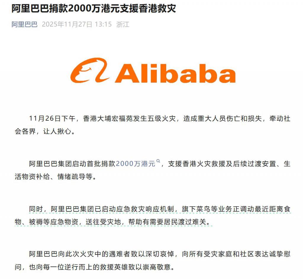阿里巴巴集团宣布,启动首批捐款 2000 万港元,支援香港火灾救援及后续过渡安置、生活物资补给、情绪疏导等。