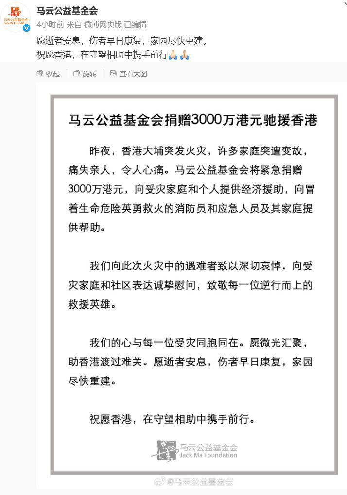11 月 27 日,马云公益基金会捐赠 3000 万港元驰援香港,向受灾家庭和个人提供经济援助。