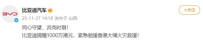 比亚迪捐赠 1000 万港元,紧急驰援香港大埔火灾救援。