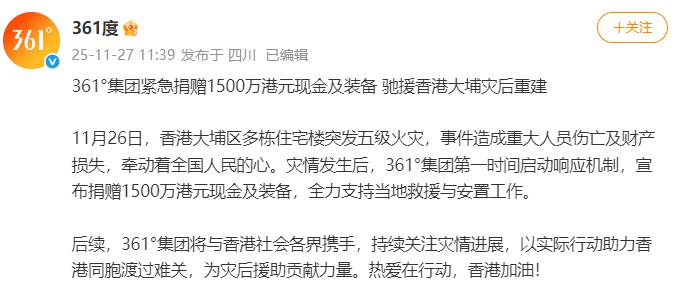 361° 集团紧急捐赠 1500 万港元现金及装备 驰援香港大埔灾后重建。