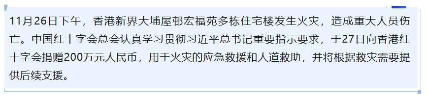 据 " 中国红十字会 " 微信公众号消息,昨天(11 月 26 日)下午,香港新界大埔屋邨宏福苑多栋住宅楼发生火灾,造成重大人员伤亡。中国红十字会总会于今天向香港红十字会捐赠 200 万元人民币,用于火灾的应急救援和人道救助,并将根据救灾需要提供后续支援。