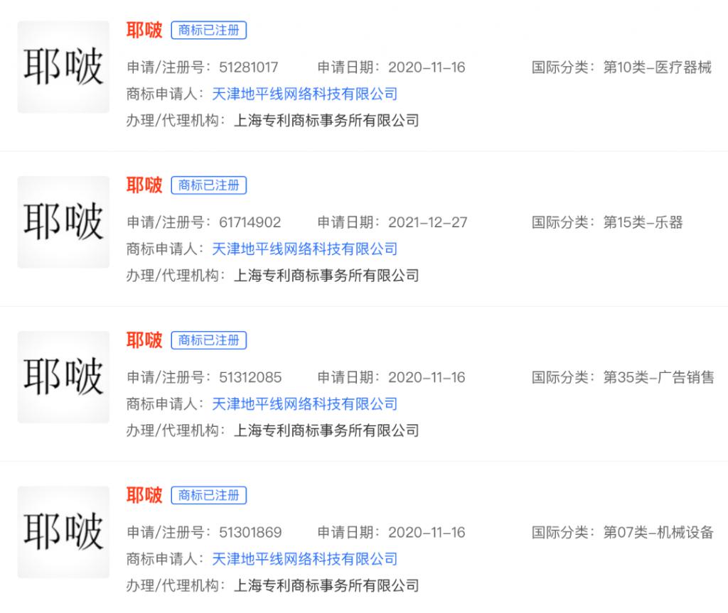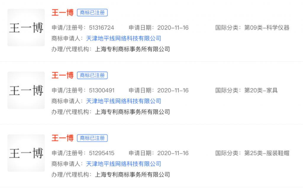 商标布局同样关键。王一博持股的天津地平线网络科技有限公司,从 2020 年起就开始注册商标," 王一博 "" 耶啵 ""WANGYIBO""YIBO" 等关键词全方位覆盖,涉及日化用品、乐器、珠宝钟表、运输工具、机械设备等多个领域,部分已经成功注册。这种 " 品牌护城河 " 一旦建立,他的商业价值就不再依赖单一演艺事业,抗风险能力大幅提升。