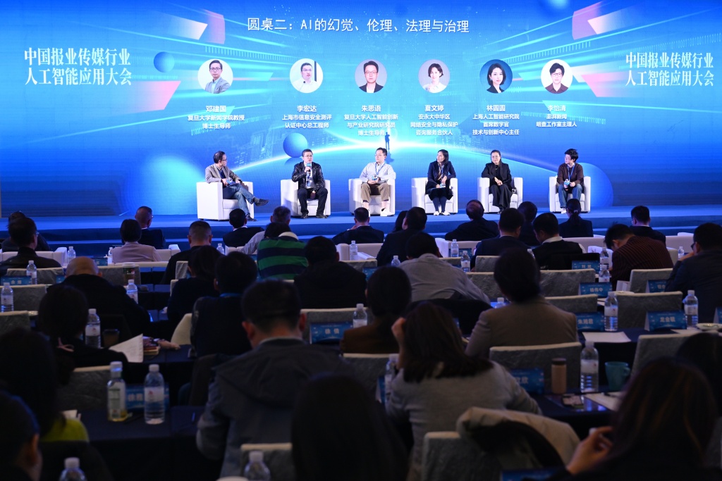 11月28日,2025中国报业传媒行业人工智能应用大会在沪举办,图为圆桌沙龙。 澎湃新闻记者 朱伟辉 摄