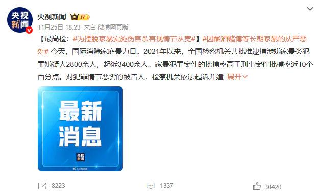 11 月 25 日是 " 国际消除家庭暴力日 ",最高人民检察院发布了反家暴的典型案例,通报了近年来检察机关依法打击家暴犯罪的基本情况和治理成效,提出 " 为摆脱家庭暴力实施伤害或杀害行为的,视情节依法从宽 "。