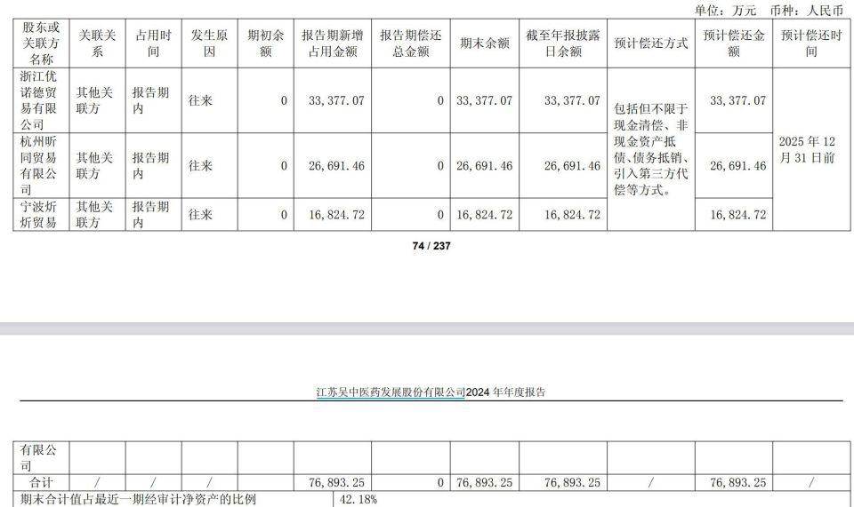 在 2024 年年报中,江苏吴中简单列示出其他关联方非经营相关占用资金情况——除了占用 3.34 亿元资金的优诺德外,杭州昕同国际贸易有限公司(以下简称杭州昕同)和宁波炘炘贸易有限公司(以下简称宁波炘炘)两家公司分别占用 2.67 亿元和 1.68 亿元,三家合计 7.69 亿元。
