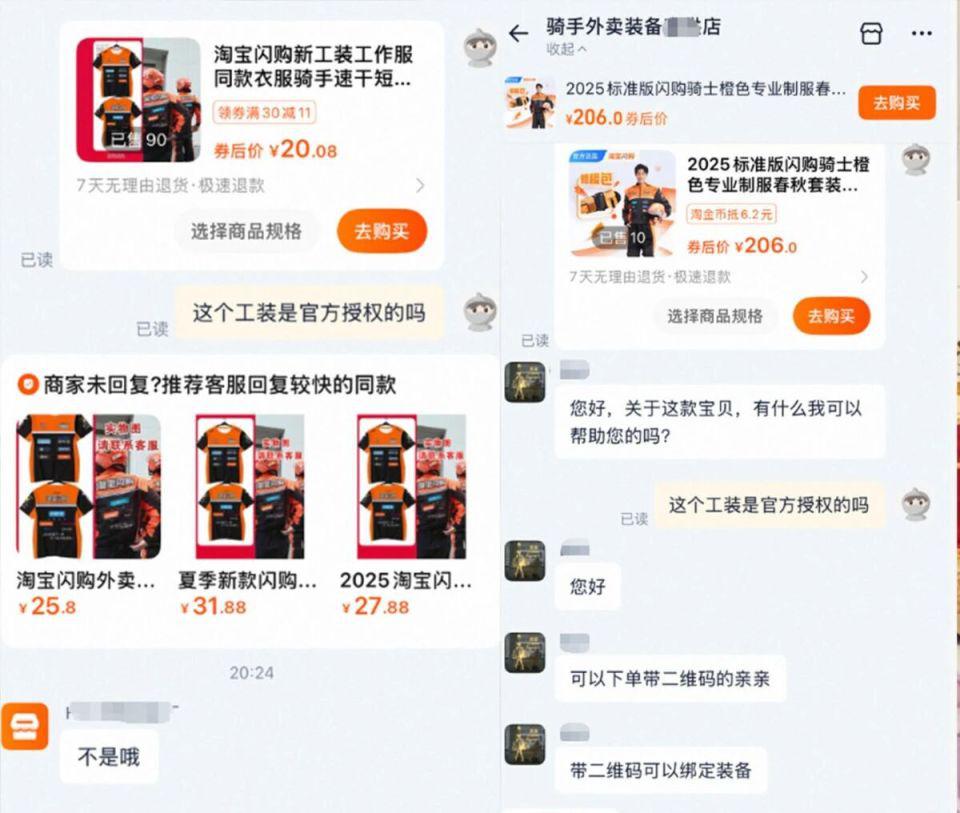 记者还发现,在多个电商平台上,都能搜索到售卖淘宝闪购外卖服的网店。记者咨询多家网店客服获悉,大部分都未获得淘宝闪购官方授权。仅有少数店家声称 " 带二维码,可绑定装备 "。12 月 16 日,记者进一步向淘宝闪购官方客服求证,暂未获回复。