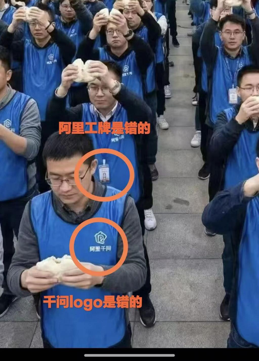 阿里内部人士表示,一眼假。「完全就是编造的,logo 也是错的,工牌也是错的,两边的标语一看就是故意造谣的。」