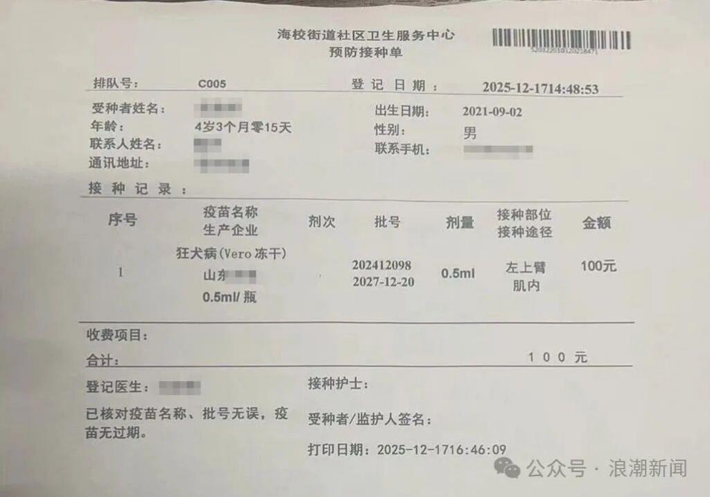 据介绍,12 月 17 日下午 1 时许,陈女士的儿子不慎被狗咬伤,随后孩子由家中老人带到该卫生服务中心接种疫苗。